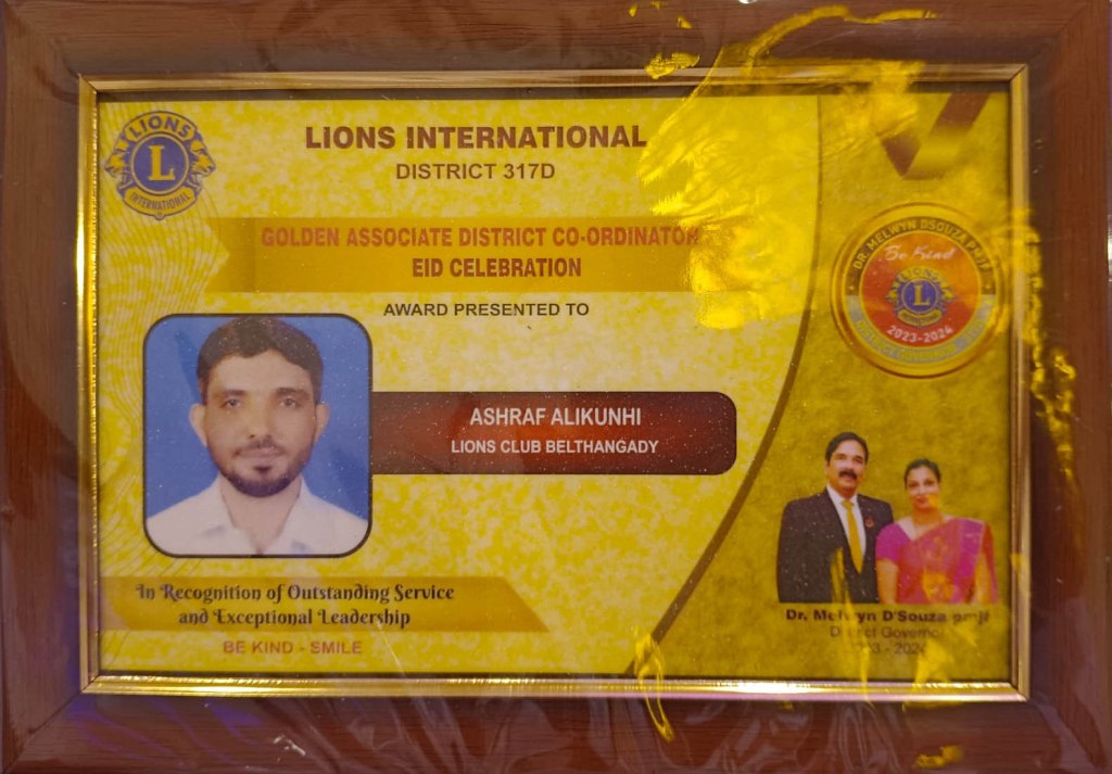 ಬೆಳ್ತಂಗಡಿ : ದ.ಕ, ಕೊಡಗು, ಚಿಕ್ಕಮಗಳೂರು ಮತ್ತು ಹಾಸನ ಈ ನಾಲ್ಕು ಕಂದಾಯ ಜಿಲ್ಲೆಗಳನ್ನೊಳಗೊಂಡ ಲಯನ್ಸ್ ಜಿಲ್ಲೆ ಇದರ ಜಿಲ್ಲಾ ರಾಜ್ಯಪಾಲರ ಸಂಪುಟದಲ್ಲಿ “ಈದ್ ಸೆಲೆಬರೇಷನ್” ಕಾರ್ಯಕ್ರಮದ ಅಸೋಸಿಯೇಟ್ ಡಿಸ್ಟ್ರಿಕ್ಟ್ ಕಾರ್ಡಿನೇಟರ್ ಆಗಿ ಅತ್ಯುತ್ತಮವಾಗಿ ಸೇವೆ ಸಲ್ಲಿಸಿ, ಮಂಗಳೂರಿನಲ್ಲಿ ನಡೆದ ಈದ್ ಸೆಲೆಬರೇಷನ್ ಕಾರ್ಯಕ್ರಮವನ್ನು ಸುಂದರವಾಗಿ ನಿರೂಪಿಸಿ ಬೆಳ್ತಂಗಡಿ ಲಯನ್ಸ್ ಕ್ಲಬ್ ಸುವರ್ಣ ವರ್ಷದಲ್ಲಿ ಎರಡನೇ ಬಾರಿ ಜಿಲ್ಲೆಯಲ್ಲಿ ಪ್ರಥಮ ಸ್ಥಾನ ಬರುವಲ್ಲಿ ಕೊಡುಗೆ ನೀಡಿದ ಅಶ್ರಫ್ ಆಲಿಕುಂಞಿ ಮುಂಡಾಜೆ (ಅಚ್ಚು ಮುಂಡಾಜೆ) ಅವರಿಗೆ ಲಯನ್ಸ್ ಜಿಲ್ಲಾ ರಾಜ್ಯಪಾಲ ಡಾ. ಮೆಲ್ವಿನ್ ಡಿ’ಸೋಜಾ ಅವರು ’ಗೋಲ್ಡನ್ ಅಸೋಸಿಯೇಟ್ ಡಿಸ್ಟ್ರಿಕ್ಟ್ ಕೋ ಆರ್ಟಿನೇಟರ್’ ಈದ್ ಸೆಲೆಬರೇಷನ್ ಗೋಲ್ಡನ್ ಅವಾರ್ಡ್ ನೀಡಿ ಪುರಸ್ಕರಿಸಿದ್ದಾರೆ.