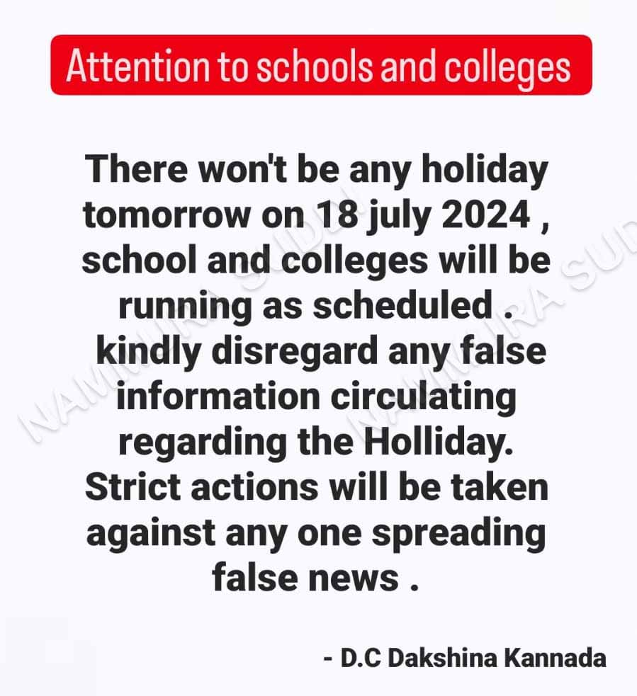 ಮಂಗಳೂರು : ಜುಲೈ 18 ರಂದು ಶಾಲೆಗಳಿಗೆ ರಜೆ ಘೋಷಿಸಲಾಗಿದೆ ಎಂದು ನಕಲಿ ಆದೇಶವು ಸಾಮಾಜಿಕ ಜಾಲತಾಣದಲ್ಲಿ ವೈರಲ್ ಆಗುತ್ತಿದ್ದು, ಈ ಬಗ್ಗೆ ಎಫ್.ಐ.ಆರ್. ದಾಖಲಿಸಲು ಜಿಲ್ಲಾಧಿಕಾರಿ ಮುಲ್ಲೈ ಮುಹಿಲನ್ ಅವರು ಆದೇಶಿಸಿದ್ದಾರೆ.