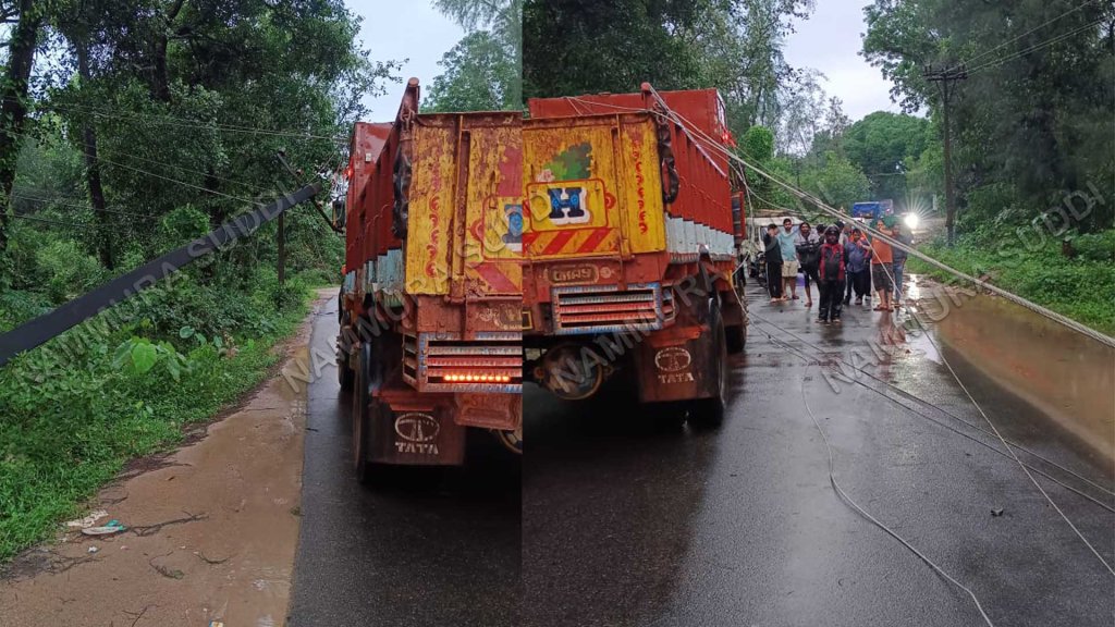 ಬೆಳ್ತಂಗಡಿ : ಬೆಳ್ತಂಗಡಿಯ ವರಕಬೆ ಎಂಬಲ್ಲಿ ಮರದ ಗೆಲ್ಲು ವಿದ್ಯುತ್ ತಂತಿ ಮೇಲೆ ಬಿದ್ದ ಪರಿಣಾಮವಾಗಿ ಚಲಿಸುತ್ತಿದ್ದ ಲಾರಿ ಮೇಲೆ ವಿದ್ಯುತ್ ಕಂಬ ಬಿದ್ದ ಘಟನೆ ಜು.24ರಂದು ವರದಿಯಾಗಿದೆ. ಇದೇ ವೇಳೆ ವಿದ್ಯುತ್ ತಂತಿಗಳು ರಸ್ತೆಯ ಮೇಲೆ ಬಿದ್ದ ಪರಿಣಾಮ ಆ ರಸ್ತೆಯಲ್ಲಿ ಚಲಿಸುತ್ತಿದ್ದ ಬೈಕ್ ಸವಾರರಿಬ್ಬರು ಸ್ಕಿಡ್ ಆಗಿ ಬಿದ್ದಿದ್ದಾರೆ.