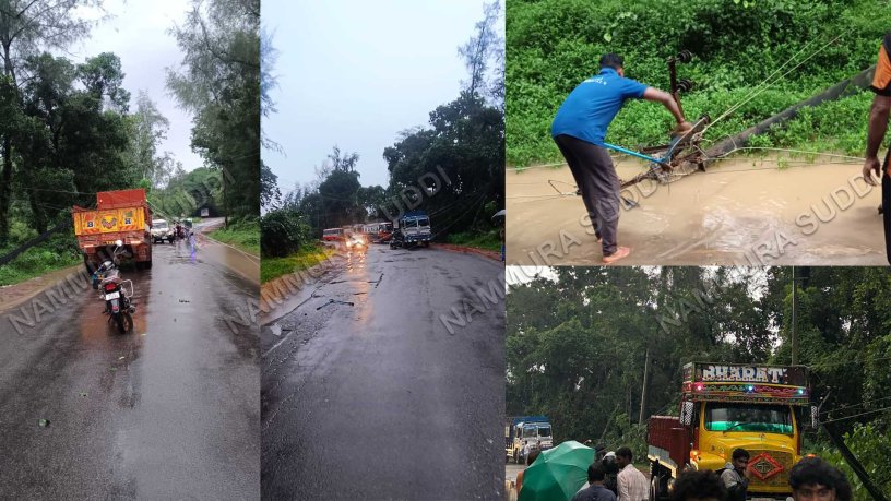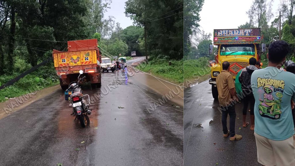 ಬೆಳ್ತಂಗಡಿ ತಾಲೂಕಿನ ಕುವೆಟ್ಟು ಗ್ರಾಮದ ವರಕಬೆ ರಾಷ್ಟ್ರೀಯ ಹೆದ್ದಾರಿಯಲ್ಲಿ ಜು.24 ರಂದು (ಇಂದು) ಬೆಳಗ್ಗೆ ವಿದ್ಯುತ್ ತಂತಿಯ ಮೇಲೆ ಮರದ ಗೆಲ್ಲು ಬಿದ್ದ ಪರಿಣಾಮ ಮದಡ್ಕ ಕಡೆಯಿಂದ ಗುರುವಾಯನಕೆರೆ ಕಡೆ ಬರುತ್ತಿದ್ದ ಲಾರಿ ಮೇಲೆ ಏಕಾಏಕಿ ವಿದ್ಯುತ್ ಕಂಬವೊಂದು ಮುರಿದುಬಿದ್ದಿದೆ. ಈ ವೇಳೆ ವಿದ್ಯುತ್ ತಂತಿಯು ರಸ್ತೆಯ ಮೇಲೆ ಬಿದ್ದಿದ್ದು, ಈ ರಸ್ತೆಯಲ್ಲಿ ಚಲಿಸುತ್ತಿದ್ದ ಎರಡು ಬೈಕ್ ಸವಾರರು ಸ್ಕಿಡ್ ಆಗಿ ರಸ್ತೆಗೆ ಬಿದ್ದಿದ್ದಾರೆ. ಘಟನೆಯ ವೇಳೆ ವಿದ್ಯುತ್ ಲೈನ್ ಆಫ್ ಆದ ಕಾರಣ ಬೈಕ್ ಸವಾರರು ಮತ್ತು ಲಾರಿ ಚಾಲಕ ಯಾವುದೇ ಅಪಾಯವಿಲ್ಲದೆ ಪಾರಾಗಿದ್ದಾರೆ. ಲಾರಿ ಮೇಲೆ ವಿದ್ಯುತ್ ಕಂಬ ಬಿದ್ದಿದ್ದರಿಂದ ಸುಮಾರು ಒಂದು ಗಂಟೆಗಳ ಕಾಲ ರಸ್ತೆ ಸಂಚಾರ ಅಸ್ತವ್ಯಸ್ಥಗೊಂಡಿತ್ತು.