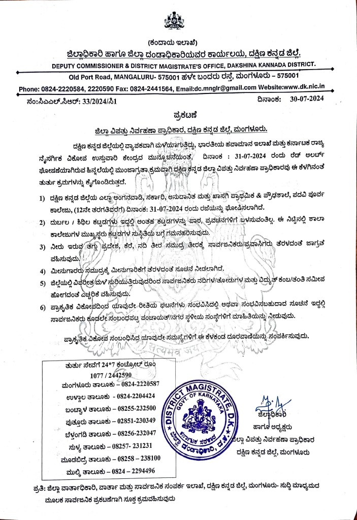 ದಕ್ಷಿಣ ಕನ್ನಡ ಜಿಲ್ಲೆಯಲ್ಲಿ ವ್ಯಾಪಕ ಮಳೆಯಾಗುತ್ತಿದ್ದು ಭಾರತೀಯ ಹವಾಮಾನ ಇಲಾಖೆ ಮತ್ತು ಕರ್ನಾಟಕ ರಾಜ್ಯ ನೈಸರ್ಗಿಕ ವಿಕೋಪ ಉಸ್ತುವಾರಿ ಕೇಂದ್ರದ ಮುನ್ಸೂಚನೆಯಂತೆ ದಿನಾಂಕ: 31-07-2024ರಂದು ರೆಡ್ ಅಲರ್ಟ್ ಘೋಷಣೆಯಾಗಿದ್ದು, ಮುನ್ನೆಚ್ಚರಿಕಾ ಕ್ರಮವಾಗಿ ದಕ್ಷಿಣ ಕನ್ನಡ ಜಿಲ್ಲೆಯ ಎಲ್ಲಾ ಅಂಗನವಾಡಿ, ಸರ್ಕಾರಿ, ಅನುದಾನಿತ ಮತ್ತು ಖಾಸಗಿ ಪ್ರಾಥಮಿಕ, ಪ್ರೌಢ ಶಾಲೆ ಹಾಗೂ ಪದವಿ ಪೂರ್ವ ಕಾಲೇಜು (12ನೇ ತರಗತಿವರೆಗೆ) ಗಳಿಗೆ ದಿನಾಂಕ: 31-07-2024 ರಂದು ರಜೆಯನ್ನು ಘೋಷಿಸಿ ದ.ಕ. ಜಿಲ್ಲಾಧಿಕಾರಿ ಮುಲ್ಲೈ ಮುಹಿಲನ್ ಅವರು ಆದೇಶಿಸಿದ್ದಾರೆ.